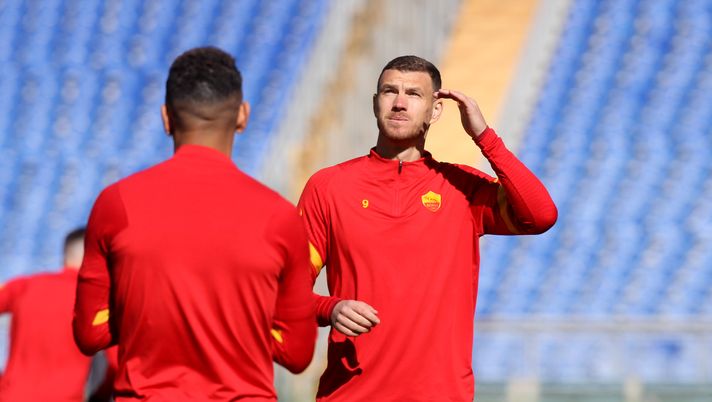 ROME, ITALY - FEBRUARY 14: Edin Dzeko of Roma warms up prior to the Serie A match between AS Roma and Udinese Calcio at Stadio Olimpico on February 14, 2021 in Rome, Italy. Sporting stadiums around Italy remain under strict restrictions due to the Coronavirus Pandemic as Government social distancing laws prohibit fans inside venues resulting in games being played behind closed doors. (Photo by Paolo Bruno/Getty Images)