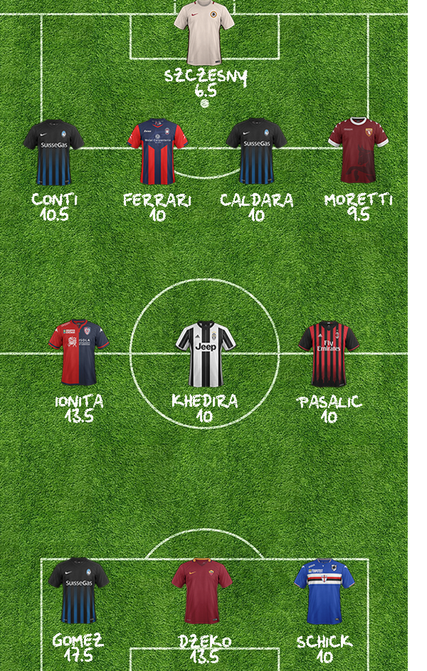 "In una giornata povera di gioie per i portieri, Szczesny col suo 6.5 risulta essere il miglior estremo difensore meritandosi il posto nella nostra Top11. Davanti a lui due difensori goleador dell'Atalanta, Conti e Caldara, che quest anno hanno già segnato 11 gol complessivamente. A completare il reparto difensivo altri due giocatori andati a rete, Ferrari del Crotone e Moretti del Torino. A centrocampo, insieme al mediano Khedira, troviamo Ionita (doppietta a Palermo) e Pasalic. Il tridente d'attacco è formato da Schick, Dzeko e ovviamente Gomez.
