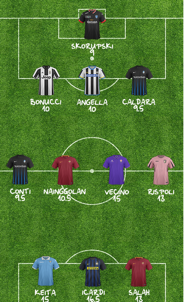 "Dopo qualche settimana di assenza, torna nella nostra Top 11 Skorupski grazie al rigore parato a Suso e fondamentale per la conquista dei tre punti dell'Empoli. Il terzetto difensivo è composto dalla sicurezza, Bonucci, dalla sorpresa dell'anno, Caldara, e dal nome che non t'aspetti, Angella. Sugli esterni di centrocampo troviamo il solito Conti e Rispoli, autore di un'inutile doppietta al'Olimpico. La coppia di centrocampo è composta da Vecino, a segno con una doppietta nel rocambolesco successo della Fiorentina sull'Inter, e da Nainggolan, che con questa rete raggiunge per la prima volta nella sua carriera la doppia cifra. Il tridente offensivo vede Icardi al centro grazie alla sua tripletta nel match del Franchi, con Keita e Salah e ai suoi lati.
