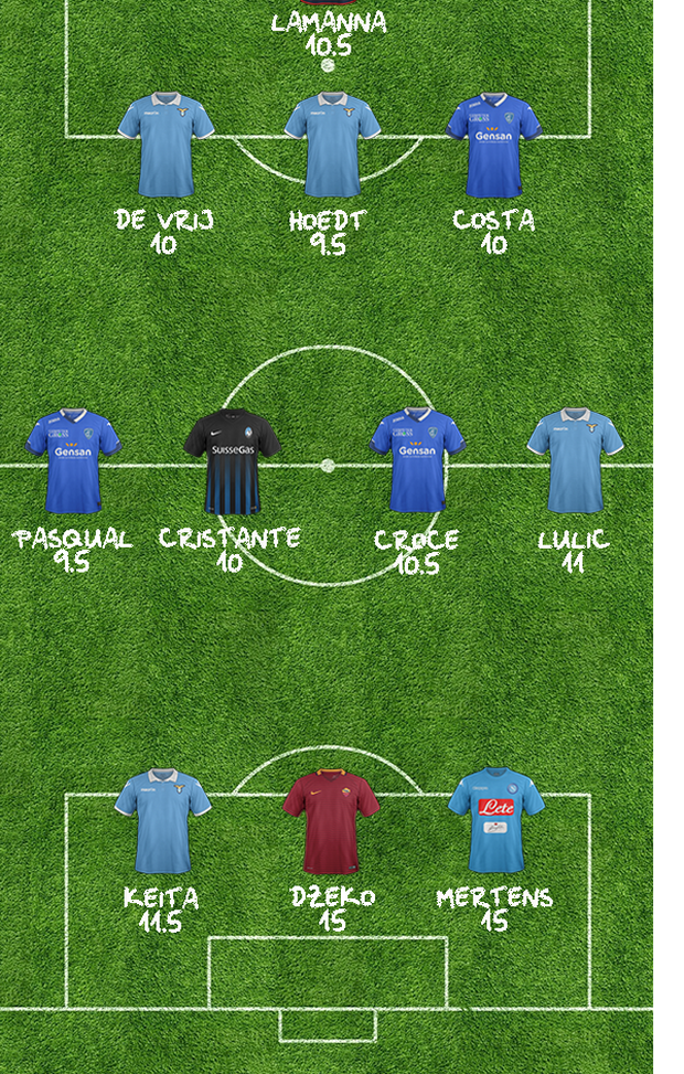 "Lamanna si conferma un ottimo pararigori neutralizzando il tiro dal dischetto di Candreva, ottenendo un fantavoto di 10,5 anche grazie ad una prestazione maiuscola. La difesa a tre è composta da due laziali, Hoedt e De Vrij, e dall'empolese Costa, andati tutti quanti a segno. Dalle stesse squadre provengono gli esterni del centrocampo, ovvero Pasqual e Lulic. A coronare l'ottima giornata dei toscani ci pensa Croce, che insieme a Cristante forma la coppia centrale del centrocampo della nostra selezione. Il tridente offensivo è composto da un altro laziale, Keita, e dai soliti Dzeko e Mertens.