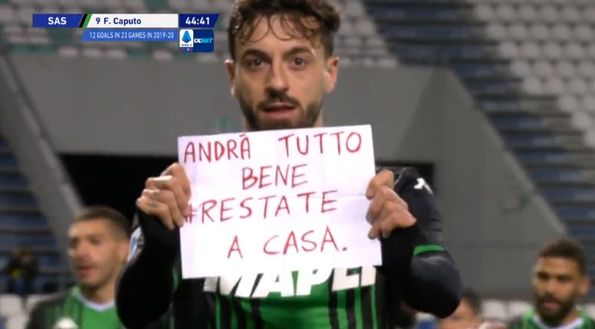 "Serata da incorniciare per Francesco Caputo. L'attaccante del Sassuolo infatti, ha guidato i suoi compagni nella vittoria appena conquistata in casa contro il Brescia, siglando una doppietta nel 3-0 definitivo. Ma a rendere ancora più perfetta la giornata è stato l'uomo e non il calciatore: in occasione della prima rete segnata sul finire del primo tempo, bomber Ciccio ha mostrato alle telecamere un foglio con su scritto "Andrà tutto bene #RestateACasa". Un chiaro messaggio di solidarietà rivolto a tutti gli italiani, sconvolti dall'emergenza Coronavirus.